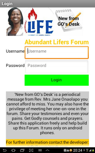 This is a meeting place for all Abundant Lifers all over the World. A chat application that integrates periodical messages from the General Overseer, Rev. Mrs Jane Onaolapo and affords users the opportunity to explore the Church's website.