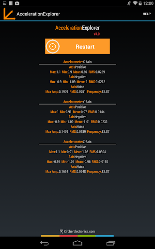 Acceleration Explorer allows the user to investigate the noise, offset and skew associated with the accelerometer sensor on Android devices. After a quick calibration process, Acceleration Explorer will calculate the magnitude of each axis and the noise associated with it. Acceleration Explorer also determines the minimum and maximum amplitudes of each axis along with the update frequency of the acceleration sensor.