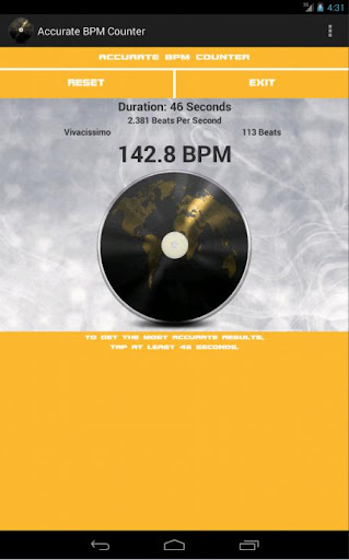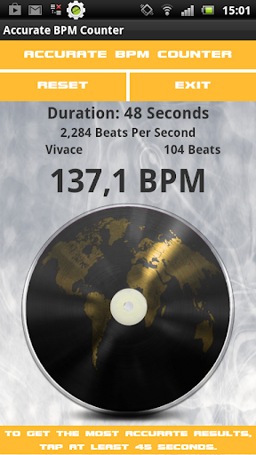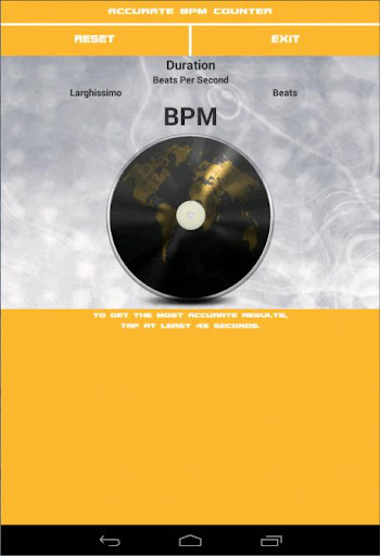 Tap the screen to see the exact tempo in "Beats Per Second" of the music you are currently listening to. The app also shows the complete scale of tempo markings, such as Allegro, Moderato, Vivace etc... Very handy for all musicians. Additional features are as well duration of your tapping, beats per second and the count of yet tapped beats.