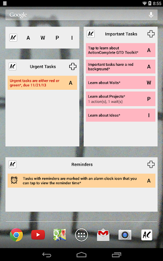 ActionComplete comes with a set of 4 app widgets. Important Tasks, Urgent Tasks, and Reminders widgets reveal the tasks that need most attention. Add Task widget enables efficient task entry right from the home screen of your phone.