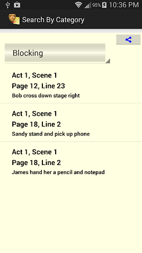 You can very quickly find the notes for any line in the play script, or the notes for an entire page or scene in the play script.