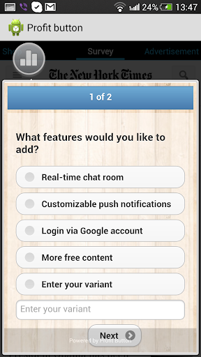 Profit Button - новый и простой сервис, позволяющий добавить в мобильное приложение опрос, рекламу, мобильный лендинг без внесения изменений в дизайне.