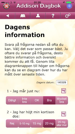 Addison Diary är din dagbok som hjälper dig att få en överblick om hur du mår i din vardag. Det kan vara svårt att minnas längre tillbaka eftersom man lätt glömmer när man inte mådde så bra. Dagboken hjälper dig och din doktor att dra rätt slutsatser runt din/dina diagnoser. Appen är både på svenska och engelska.