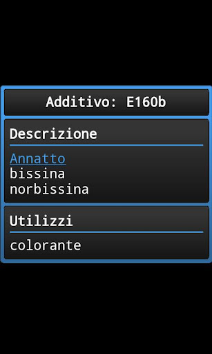 Questa applicazione, completamente in Italiano, conosce circa 400 additivi alimentari e le loro varianti. È sufficiente inserire il codice a tre o quattro cifre (es. 160 per E160).