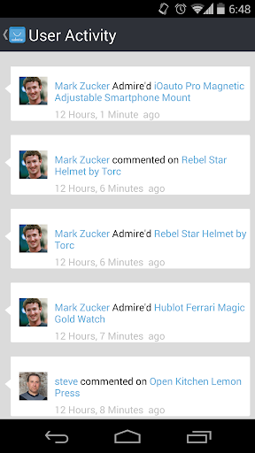 3. User activity with push notifications. You get notifications when some one comments, admires your product, follows you etc.