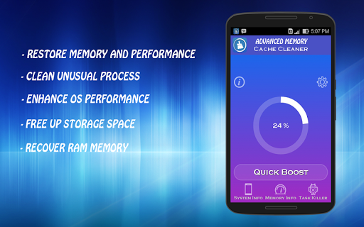 Is your Android device feeling slow and sluggish? It is time to boost your Phone / Tablet to highest performance levels. Advanced Memory Cleaner app super charges the performance of your android device. Is your mobile device’s storage space clogged up with old files and unused apps gathering dust? Advanced Memory CCleaner, a FREE app designed to help you clear up redundant or malicious apps and files, free up storage space, clean up your RAM, and speed up and memory booster your Android device. Just give a few seconds to tidy up your phone and your favorite games will run faster!