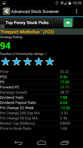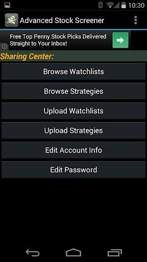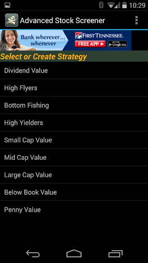 Advanced Stock Screener is a stock market research tool used to find stocks that meet a strategy. The app comes loaded with the S&P 500, The Dow Jones Industrial, the NASDAQ 100 and NASDAQ/NYSE broken down by sector. Other custom watchlists can be created. Once you select the watchlist of stocks you want to analyze, you get to select a strategy. The app ships with three screening strategies. Those strategies are Dividend Value, High Flyers and Bottom Fishing. You can also create your own strategies! Starting with version 3.0 users can share their watchlists and strategies with each other in the online Sharing Center!