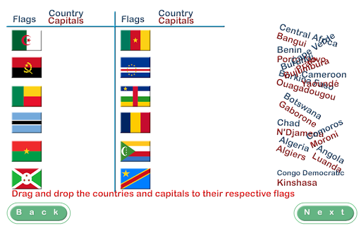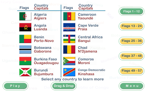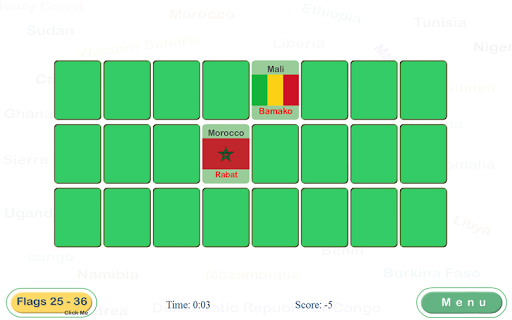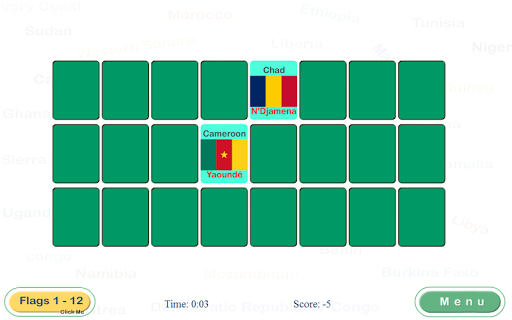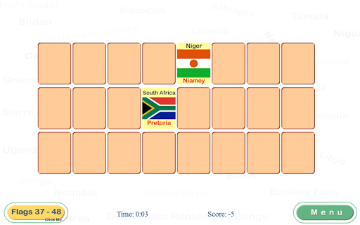 Educational Memory Card Game. Matching pairs of African Countries, capitals and flags. It will improve your memory skills and your knowledge of African's Countries, Capitals and flags.