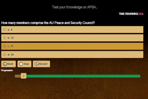 - Play the Quiz and test your Knowledge on the African Union, the APSA, the African Capitals and the African Flags and Post your results on the leaderboard.