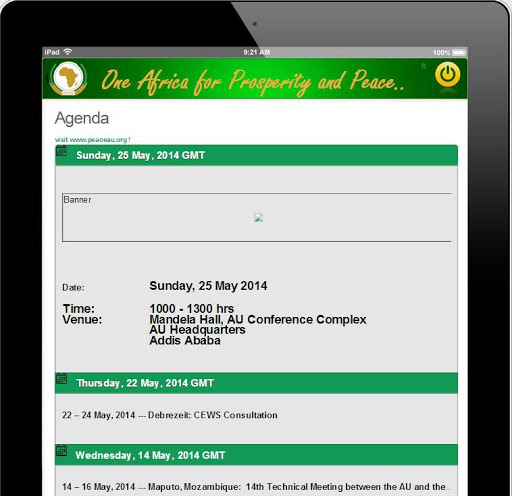 - Actualiser votre agenda avec les derniers meetings du Conseil de sécurité ( CPS de l'UA ) et le calendrier des activités du Département Paix et Sécurité de l'UA
