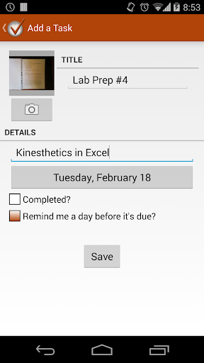 To begin, select the "Courses" tab and add your first course. After selecting it in the list, you can add assignments - and even take a photo rather than manually entering details. Set the due date and whether you'd like to receive a reminder before it's due, and check off the assignment when it's completed. What are you waiting for? Get organized with Agendum today!