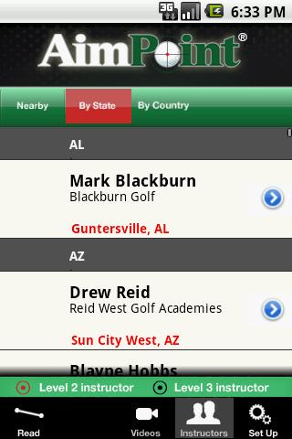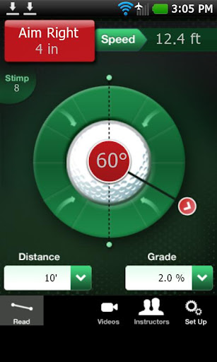 Get the power of AimPoint Technology's Emmy Award winning putt prediction software on your Android device. The same green reading physics you've seen on the Golf Channel for years is now available to all golfers and will show you the expected break and speed for your putt. Put the use of our patented AimCharts to work for multiple green speeds and slopes. In addition, the video section will give you tips on how to use AimPoint Green Reading techniques including measuring the stimp, identifying your angle to the slope, understanding optimum capture speed, and more. This app is a complement to AimPoint Green Reading instruction and does not cover the entire curriculum. For more education see an AimPoint Certified Instructor, you can find instructor listings and locations in the app.