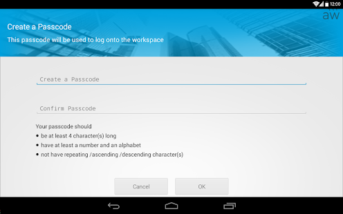 步驟 2: 一旦AirWatch Workspace已載入到您的裝置上, 請輸入您企業的認證並設定密碼。