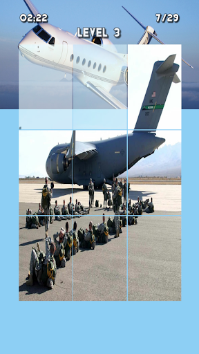 The photo will be cut into 3x3 disarranged pieces you have to put all the puzzle pieces in the correct position, you can press "Hint" to see a picture of a aircraft.