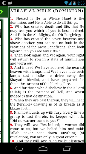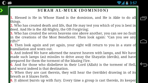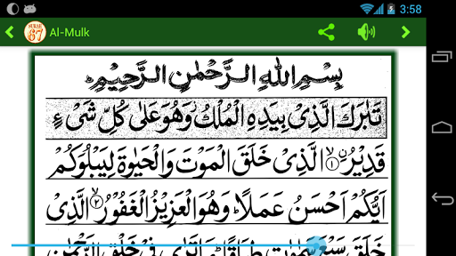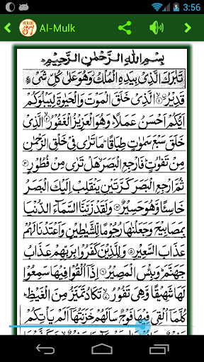 Al-Mulk is the 67th Surah of Holy Quran. You can read the Arabic Text and English translation in this application. It can be read in both orientation. You can also listen Surah Al-Mulk by pressing the play button. The recitation is in the beautiful voice of Mishary Alafasi.