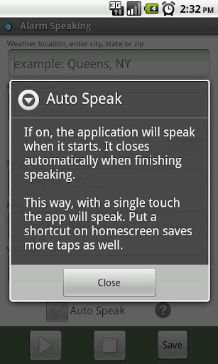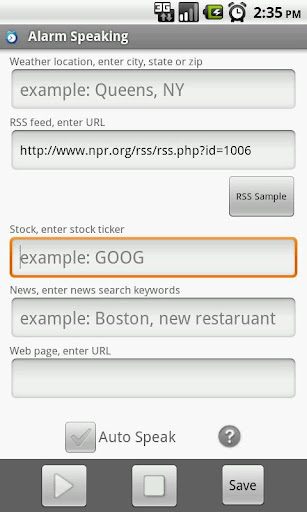 Instead of the default alarm sound, "Alarm Speaking" will speak to you when alarm is fired. Greet you, let you know date, talk the weather, RSS feed, stock, news, and more... All those are based on your preference.