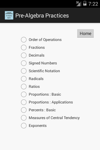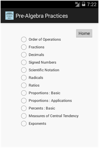 Practices section covers 24 topics in pre-algebra and algebra and each topic consists of 5 practice questions.