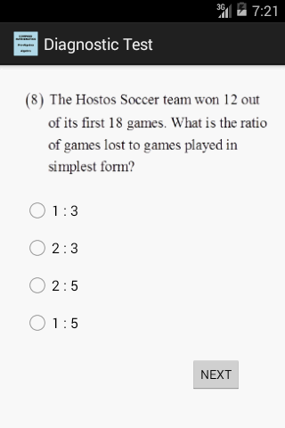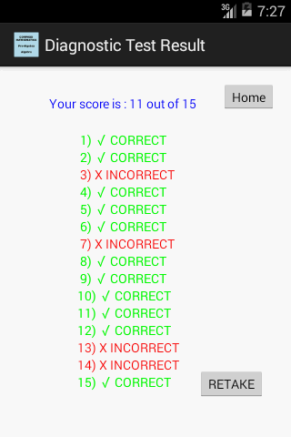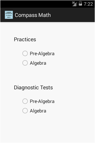 There are two separate Diagnostic Tests for pre-algebra and algebra. Each test consists of 15 questions and it will display how many questions you did correct and what are the questions that you did wrong. These tests are based on actual compass mathematics exams.