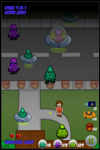 Fortunately, you can earn gold coins for every evil alien splatted. Spend coins to amp up your glorious alien kill rate with cars, explosive barrels, and lasers. There are only limited supplies of each -- use them wisely to help you defeat the invasion!