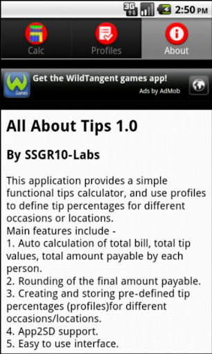 This application provides a simple functional tips calculator, and use profiles to define tip percentages for different occasions or locations.