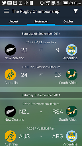 * Fixtures and scores for a huge range of competitions such as Super Rugby, The Rugby Championship, the ITM Cup and International tests from around the world