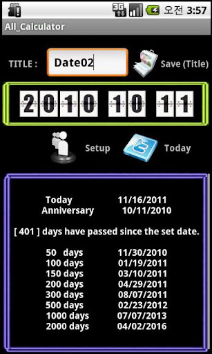 3-1. Enter the anniversary with the Setup button to show how many days have passed from the set date – 50th, 100th, 150th, 200th, 300th, 500th, 1000th, 2000th and such are immediately calculated and shown in full date format.