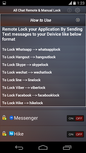 Hey are you worried about your personal chats&other data are safe?,if yes stop worrying,Download our All Chat Remote & Manual Lock Application.Lock your all application like whatapp,viber,Facebook messenger,hike,line,skype with your passwords.if you forgot to lock the app and kept your phone somewhere you have an option to send message to your device and lock the applications remotely,you can follow the below formats to send text messages