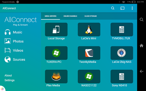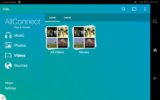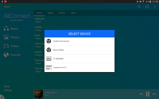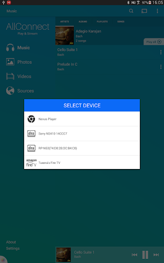 AllConnect能将安卓设备用户的本地及在线音乐、视频、照片串流到你家中的智能电视、Chromecast、Amazon FireTV、Xbox和任何AirPlay或DLNA设备上。