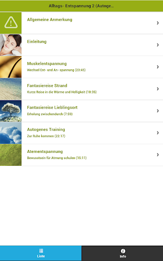 In dieser App befinden sich 5 Entspannungsübungen. Sie haben die Möglichkeit zwischen verschiedenen Techniken zu wählen.