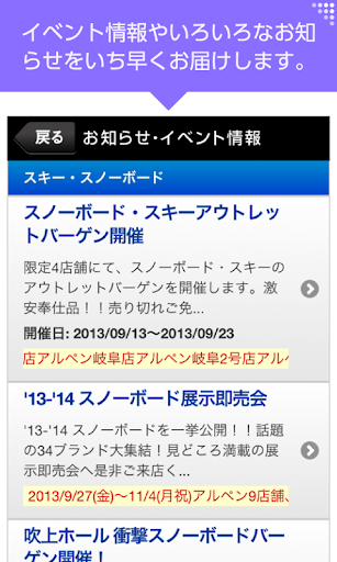 Alpen Groupアプリではスポーツデポ/アルペン/ゴルフ5 各店の情報やプライベート商品、イベント・おすすめ情報をご覧いただけます。