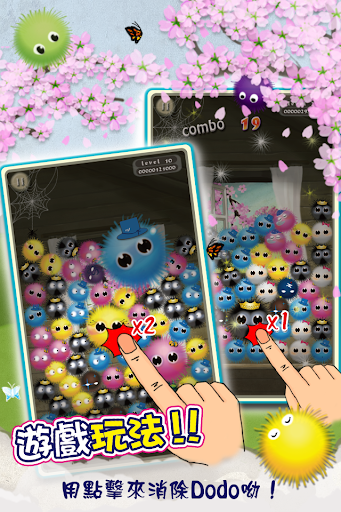 • 將大顆dodo點擊消除,即可獲得有特殊效果的特殊dodo,消除的dodo越大顆,獲得的特殊dodo越強大。消除大顆dodo後還能讓畫面充滿亮麗粉塵,這時只需輕點一下就可消除dodo囉,讓您能盡情combo。