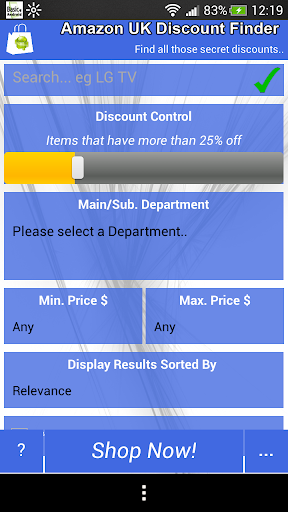 This app composes the discount level you are looking for and then opens up the results in your native web browser. If the results aren't what you expect it is likely that you have been too 'optimistic' with your requirements (eg 99% discount off TV's) and the Amazon website will just display the closest results WITHOUT the discount. Simply play around with the discount levels to see what you can find!