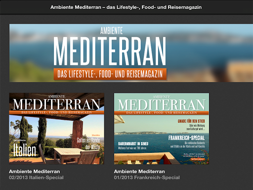 Ambiente-Mediterran - das aufwändig gestaltetete, interaktive mediterrane Lifestyle-, Reise-, Food, Living- und Kultur-Magazin. Anders als viele andere Magazine im App-Store wurde es speziell für das Tablet entwickelt. Sowohl das liebevoll gestaltete Layout als auch die vielen Animationen bieten zahlreiche Überraschungen und außergewöhnlichen Lesespaß. Interaktiv, multimedial und multisensual - für (beinahe) alle Sinne!
