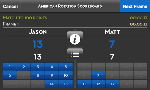 American Rotation is a billiard game based on 15 ball rotation but scored over multiple racks or frames until a point goal is reached by a player. The game incorporates equal offense in that players alternate breaks and get ball in hand after the break. This app allows a player to create a match and acts as a scorekeeper and statistician facilitating the match.