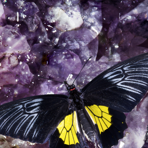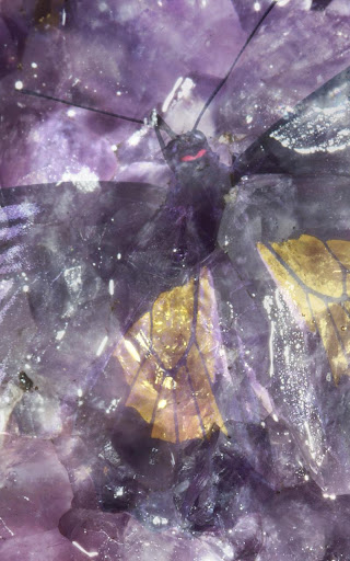 This wallpaper features original artwork created by blending photographs of an amethyst crystal, wisteria flowers and a tree on a cloudy skyline to produce a compelling image. Your view starts from a distant point to take in the entire piece of art, and then wanders around the art so you can see all of the details.