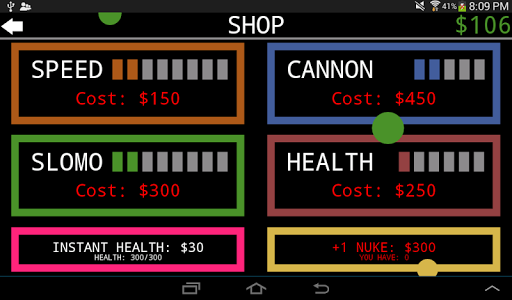 Player can buy upgrades in the shop with money earned in-game. The player can also buy health and nukes which will destroy all enemies on screen.
