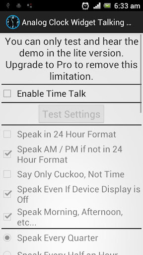 This widget is the lite version of our free Analog Clock Widget Talking Pro. It has the feature of saying the time, along with the cuckoo effect. Our Lite version allows you to preview the feature only i.e. just testing how it sounds. The Pro version has the feature of saying the time at regular intervals plus on tapping the widget also.