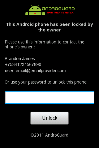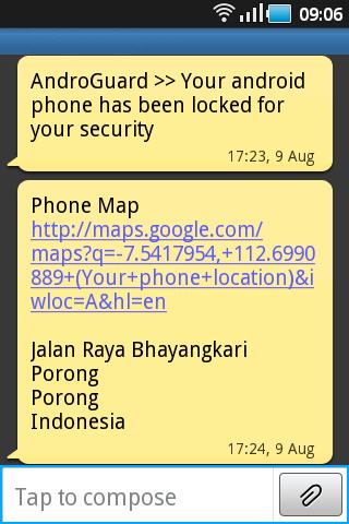 AndroGuard is a security application for your Android smartphone. AndroGuard runs by listening a command that sent from SMS via background so it doesn't interfere with user's activity. With this application, the user can locks their mobile phone, send an emergency SMS to the 5 relation, find the latest location of their mobile phones, and even delete a data on their mobile phones when it is lost.