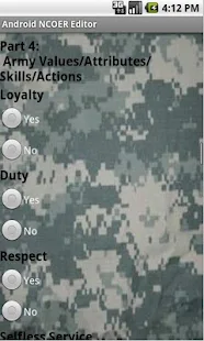 Android NCOER allows Leaders to write and edit NCOERs while away from computers. An XFDL file is created and saved and or emailed as an attachment from your Android Device. You will never have to wait for a computer to make the changes needed on an NCOER. Update running NCOERs on your time, not waiting for someone else's.