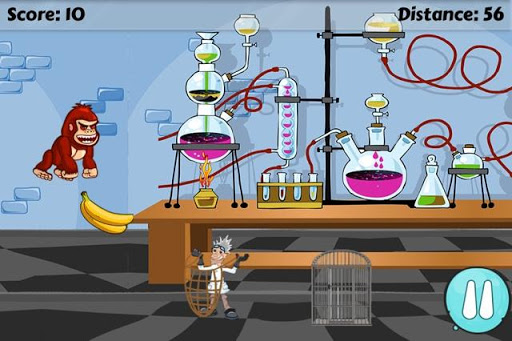 A classic side scrolling, jumping style game, where you guide the ape as far along through the level, while collecting bananas (to unlock other apes) and avoiding scientists and their cages. The app's simple game play provides the player with hours of endless fun trying to top their current high score. However, once you hit a scientist or cage, the game is over and the app displays the users current scores, high scores, current distance and furthest distance obtained.