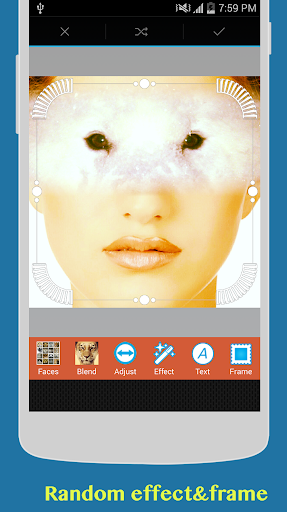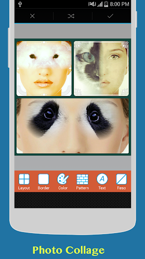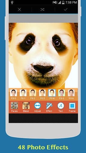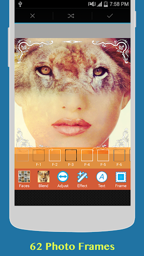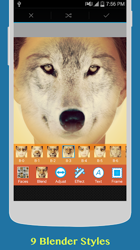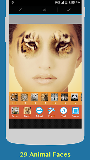 Animal Face blend your eye, mouth with animal eye, mouth, the blend area can be adjusted; Animal Face has 48 nice photo effects and 60+ photo frames to add on the photos; Animal Face has Photo Collage function for you to put all photos together.