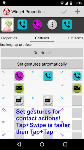 All widgets provide possibility to use various types of gestures: swipe, scroll, pinch, zoom. One-finger, two-finger and three-fingers gestures are supported. Don’t waste time to find out the icon of the action on the screen – just open widget and make short gesture to execute favorite app or start call to your friend.