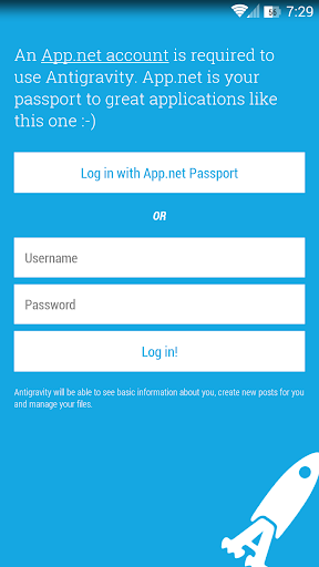 Like Orbit for Mac and iOS, Antigravity is a Droplr or CloudApp-like app based on App.net. Sign up for a free App.net account in App.net Passport and use it to authorize Antigravity!