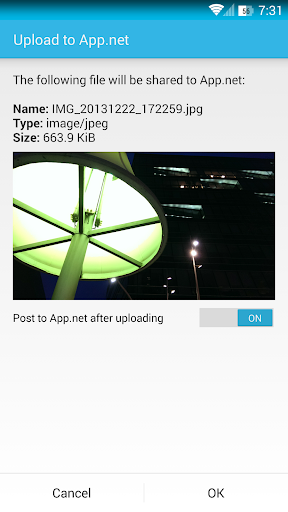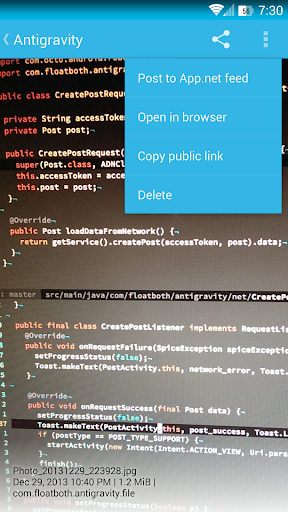 Upload a file with Antigravity and you'll get a short link you can share on any social network or through email or an instant messaging system. But there's more! Antigravity is powered by App.net and supports a lot of its features. App.net is your passport to great applications like this one. Besides using App.net for storage, you can post files – even already uploaded files – to your App.net microblogging feed as links or as embedded images. You can also delete uploaded files.
