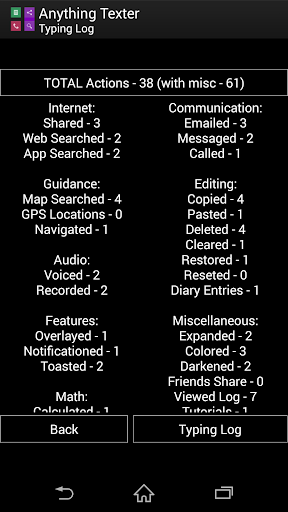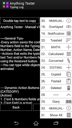 Anything Texter app let you quickly type from any screen and then manipulate the "Text" and/or Numbers to use with a variety of actions; Call, SMS Message, Email, Edit, Search, Calculate, Overlay, Share and so much more! Anything Texter potentially removes the need of opening/having more than 37+ apps resulting in an efficient and clean smart device! it even has an automatic updating Typing Log!