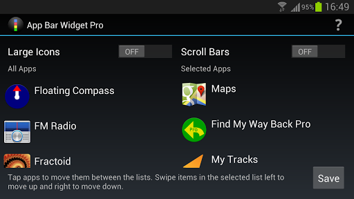 App Bar Widget is a resizable home screen widget that displays a scrolling list of app shortcut icons. You select the apps that are shown and the order that they are displayed in. You can also choose to use normal sized or larger icons and whether or not scrollbars are displayed. App Bar Widget can be resized vertically as much as your device's home screen will allow.