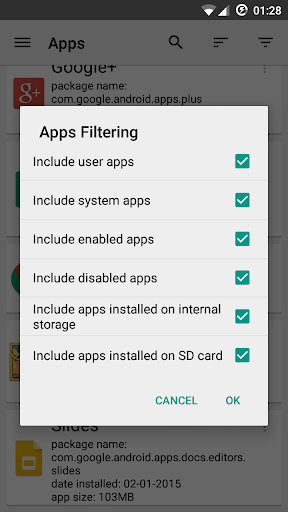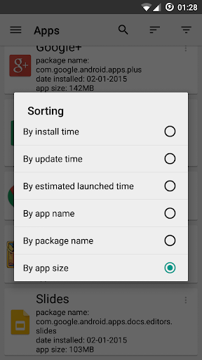 • Sort apps by size, name, package, date installed, date updated, launch time