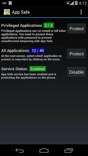 Protects applications from nosy friends and children with a password. sms, gmail, calendar, contacts, chat, email, settings, photos, videos.