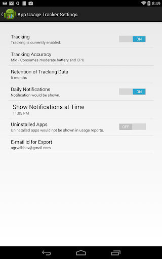 1. Providing e-mail id in "Email id for export" setting is optional. If provided then the e-mail id would be pre-populated when sending app usage through e-mail.