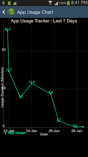 - Tap on a particular app name in the list, will open up a time-series graph depicting the usage pattern.